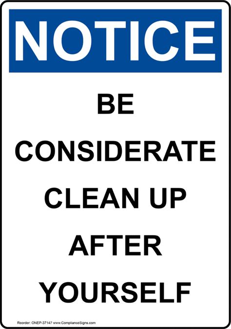 Portrait OSHA NOTICE Be Considerate Clean Up After Yourself Sign, Plastic | Size: 7X5, ONEP-37147 | By Compliancesigns